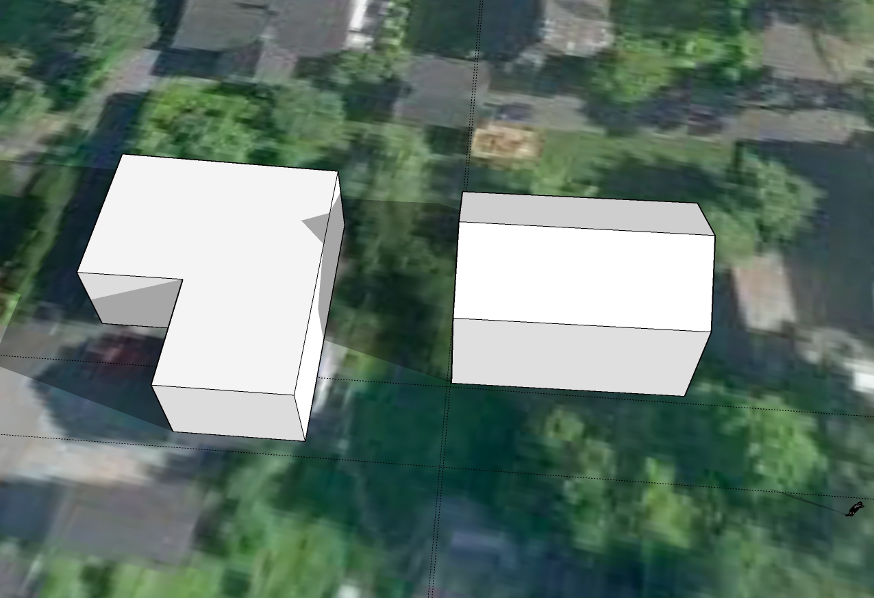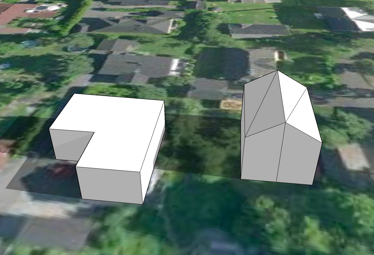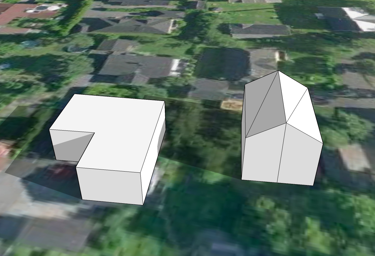 Derfor en forklaring isteden. Formen på huset vårt er veldig veldig forenklet. Vi har ikke flatt tak, slik at "taket" her er ca gesimghøyde. I tillegg er det jo en terrasse foran huset og dermed er husveggen egentlig litt over tre meter innenfor "veggen". Den korte delen er garasjen. Det hele er vesentlig bedre synlig i skyggevideoene, så at det har hele tiden vært mulig å tolke helheten riktig.