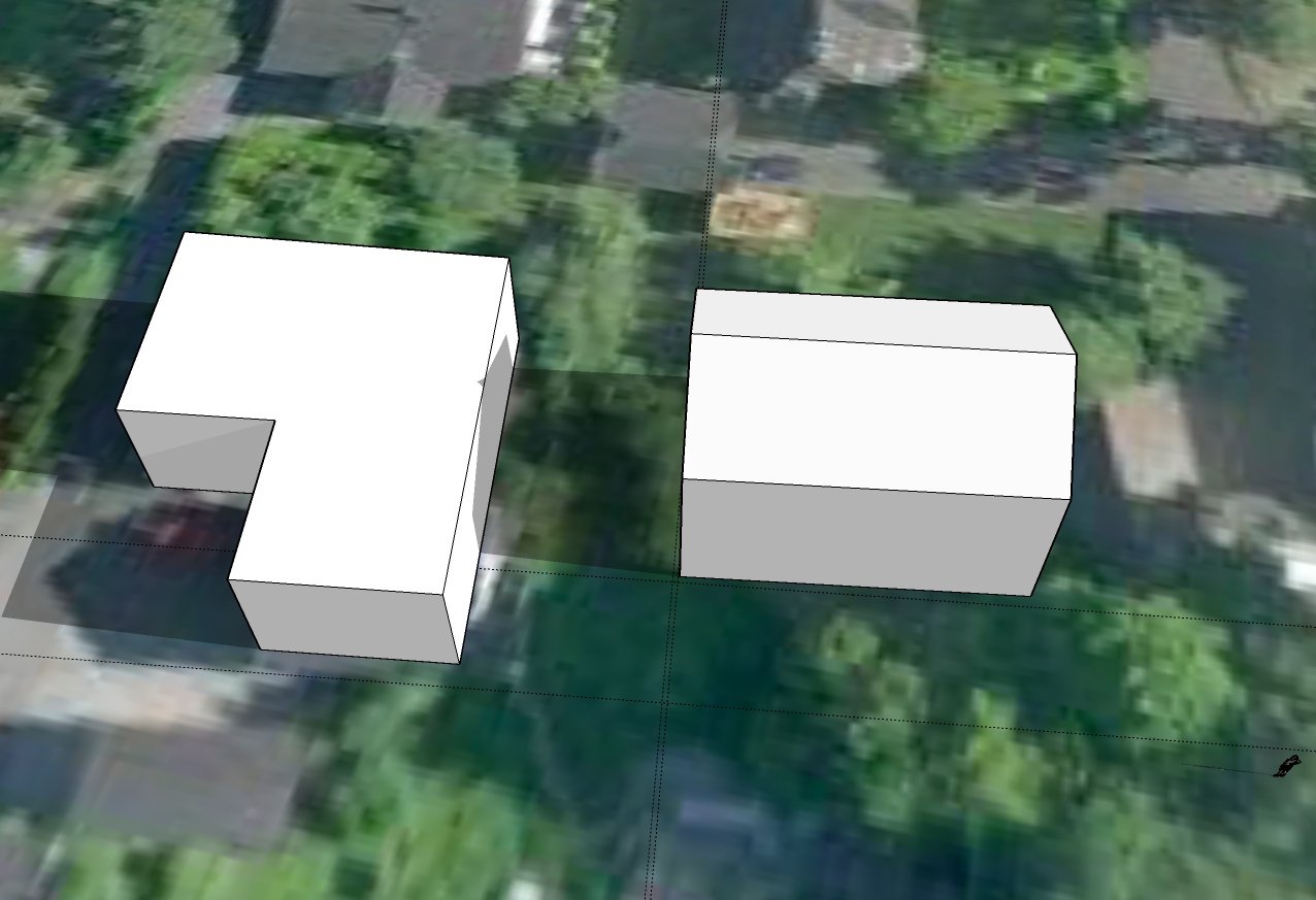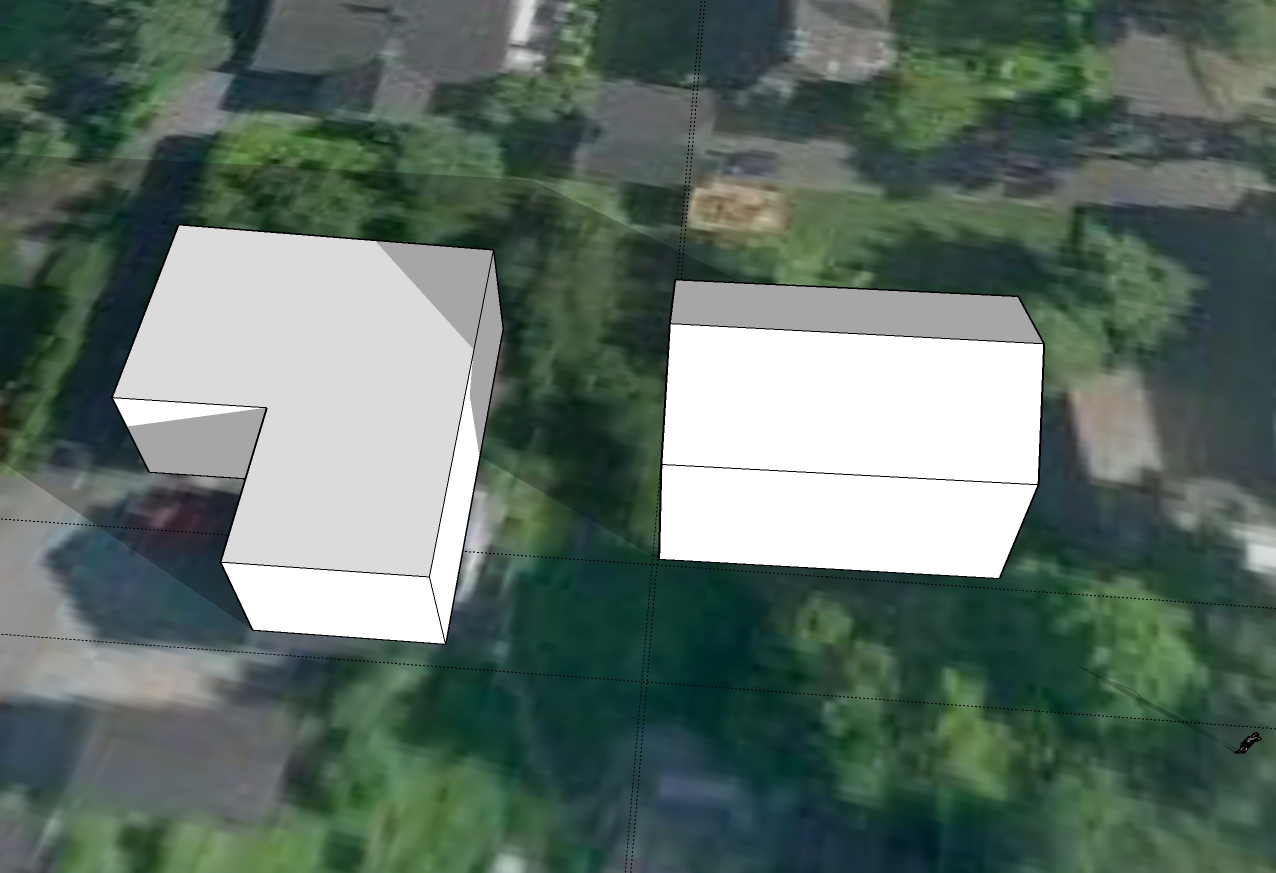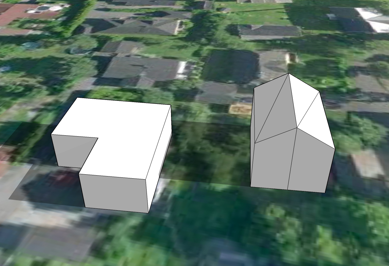 Derfor en forklaring isteden. Formen på huset vårt er veldig veldig forenklet. Vi har ikke flatt tak, slik at "taket" her er ca gesimghøyde. I tillegg er det jo en terrasse foran huset og dermed er husveggen egentlig litt over tre meter innenfor "veggen". Den korte delen er garasjen. Det hele er vesentlig bedre synlig i skyggevideoene, så at det har hele tiden vært mulig å tolke helheten riktig.